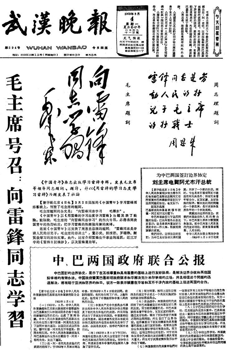 1963年3月4日,《武汉晚报》头版头条刊发了毛泽东同志“向雷锋同志学习”的题词。