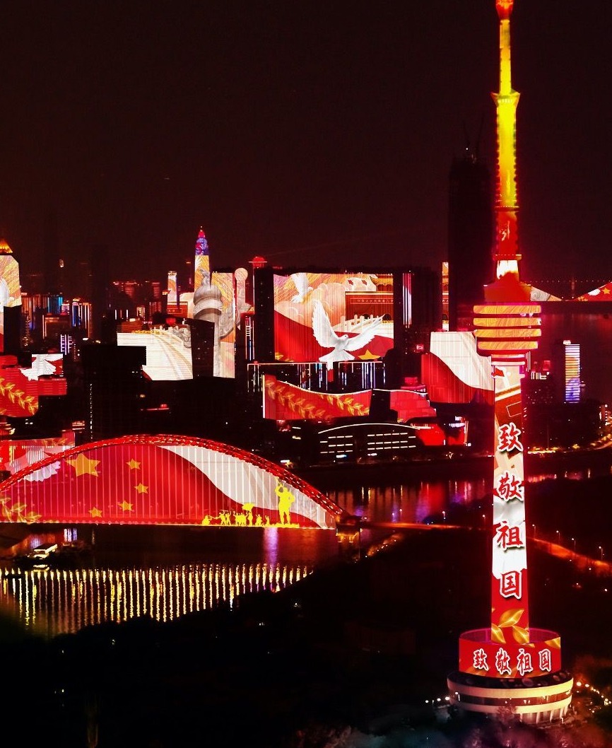 国庆期间,每日19:00开始,武汉两江四岸25公里岸线上的建筑楼体、桥体、江上游船、山体以及趸船码头将变身华丽大幕,不断变换五彩动画。用一幕幕光影展示祖国与人民、城市紧密相连、众志成城的时代精神。