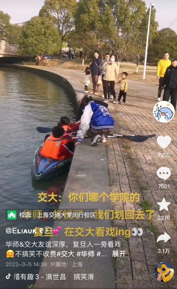 近日,有网友发布视频称,两名华东师范大学的学生划船走水路前往上海交通大学“串门”,被保安发现后原路返回。对此,上海交通大学(闵行校区)保卫处的员工表示,无法确定二人是不是华师学生,但学校有规定不能划船。