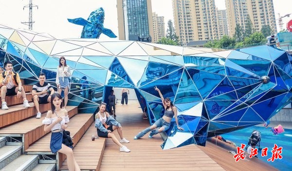 青山印象城有全球最大的双子江豚雕塑,这也是青山的新地标。趁着假日,一群年轻人在此聚会,与江豚相映成趣。