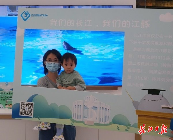 长江日报-长江网10月2日讯(记者高宝燕)10月2日上午,在楚河汉街华为店里,大屏幕上播放着江豚保护宣传片,江豚可爱萌趣的形象吸引很多市民前来观看,武昌市民范飞带着2岁多的儿子和江豚欣喜同框合影。