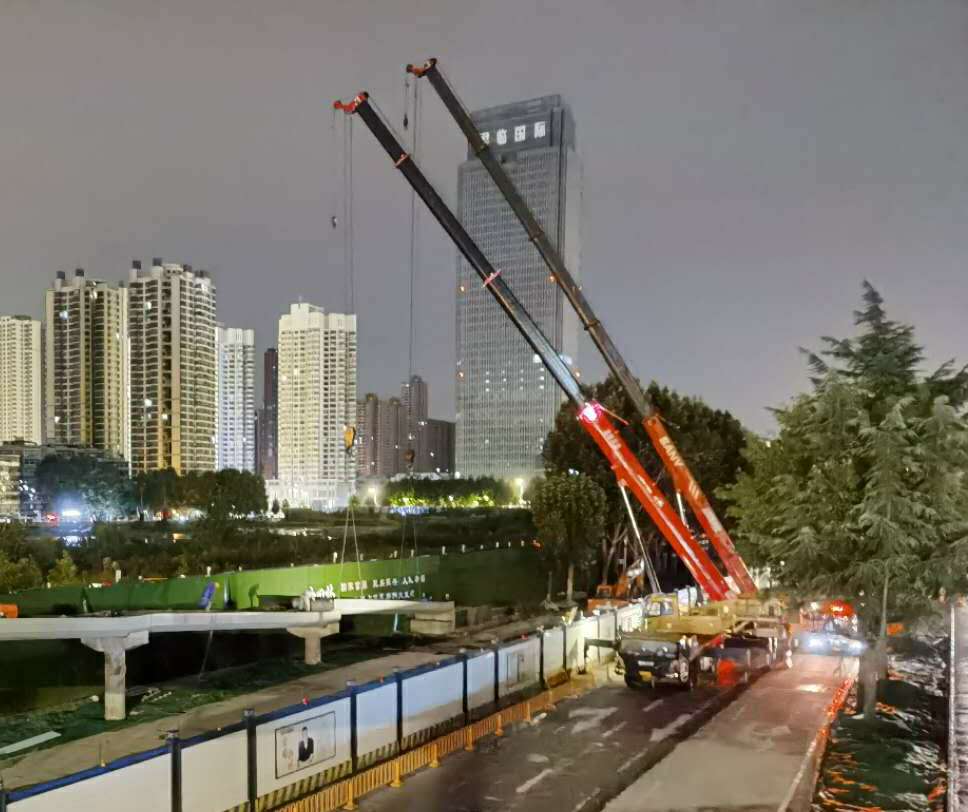 5日凌晨,友谊大道(武车路-宏茂巷)快速化改造工程施工二标段正在吊装人行天桥。通讯员李晓静 提供