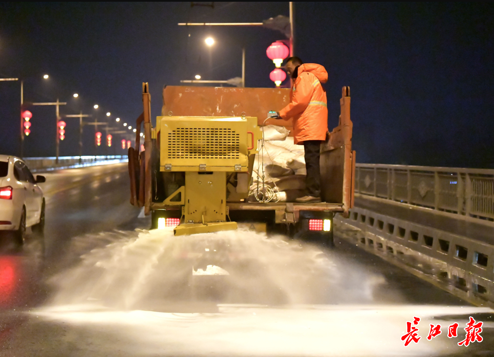1月28日凌晨1时,汉阳区城管委建桥城管所作业人员操作融雪撒布机开始对长江大桥桥面抛撒融雪剂,以防桥面结冰打滑,保障道路车辆行车安全。长江日报记者刘斌 摄
