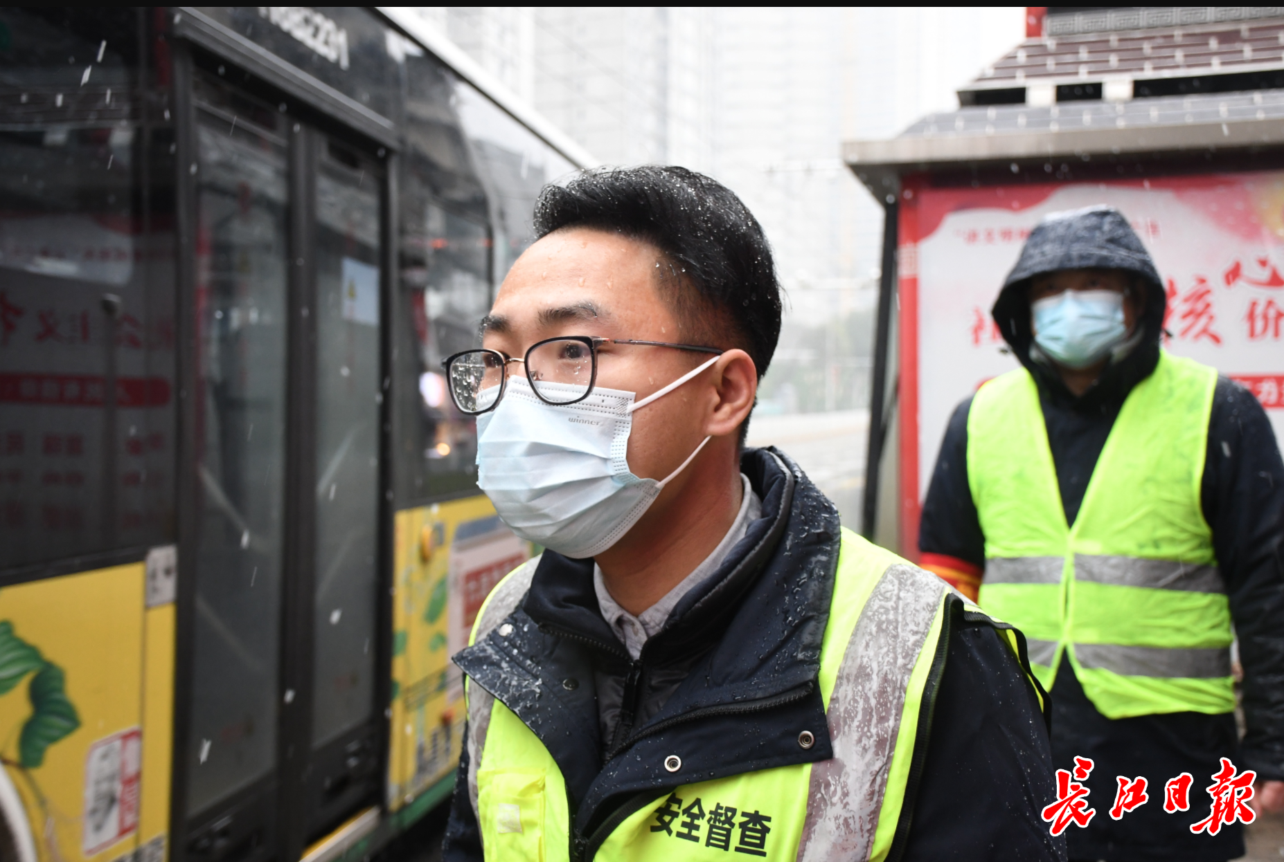 在汉阳钟家村公交车站,武汉公交四公司的安全员顶着风雪在公交站进行安全保障工作。长江日报记者詹松 摄