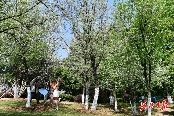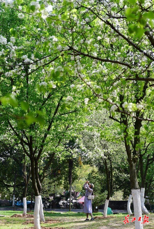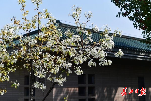 据了解,东湖听涛景区在20世纪50年代确有大片梨园,后因病虫害而逐步淘汰。近年来,听涛景区先后引种了棠梨、丰水梨等品种,梨园广场也在改造后栽种了豆梨,各种梨树总数超过百余株。眼下,这些梨树正值盛花期,雪白的花朵和嫩绿的新叶齐放枝头。(长江日报记者李永刚 摄影报道)