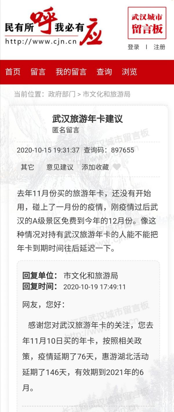 长江日报-长江网10月20日讯(记者孙笑天)购买了大武汉旅游年卡,只用了两次就再没用过。近日,市民杨先生在长江网武汉城市留言板咨询,今年的武汉旅游年卡期限能否延长。对此,相关部门表示,此前,已发布武汉旅游年卡延期通告,最多可延长222天。