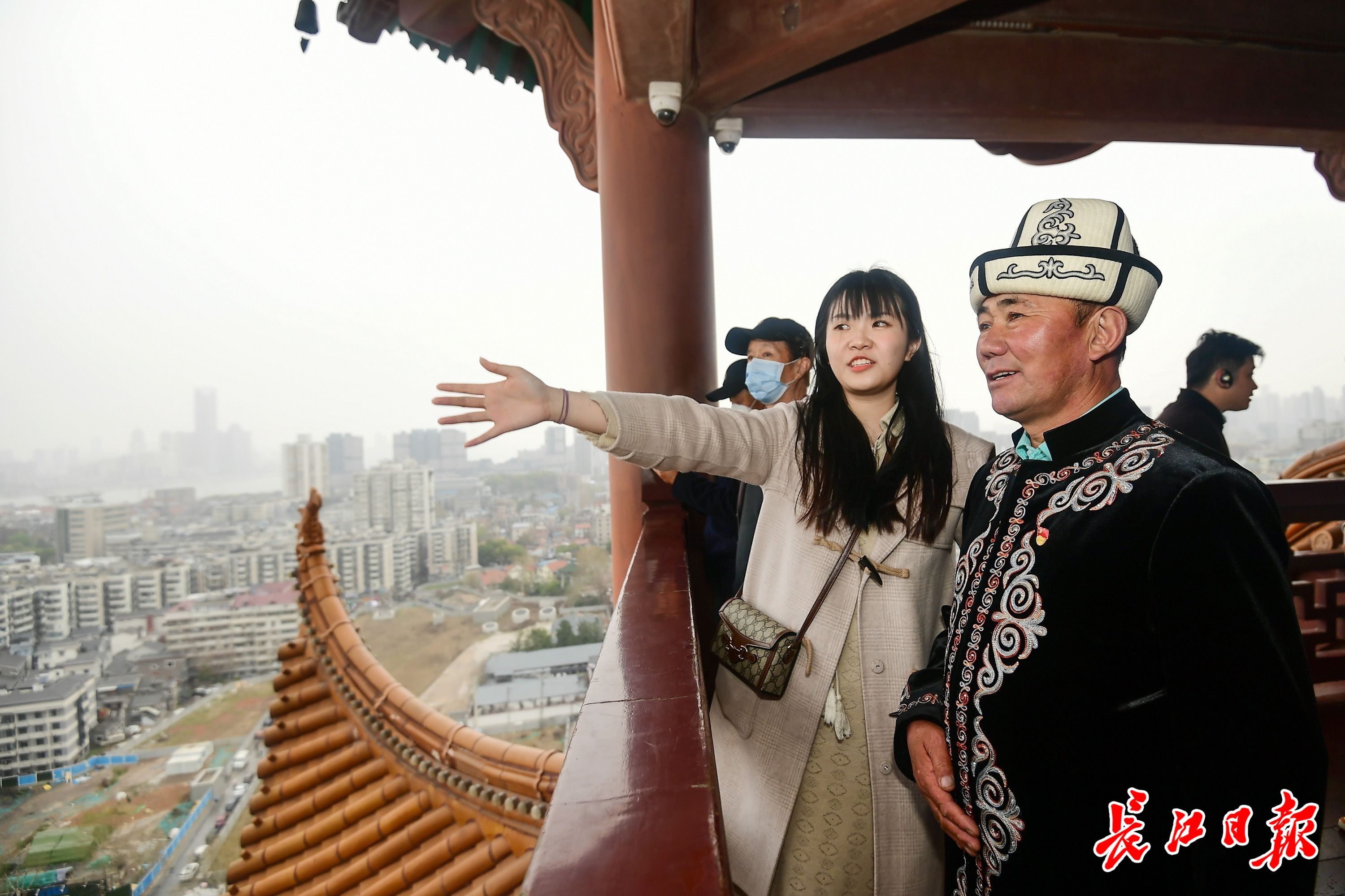 新疆牧民大叔阿布都加帕尔·猛德(右)在曾被救助的武汉市民姚贝妮的陪同下登上黄鹤楼。 长江日报记者 史伟 摄
