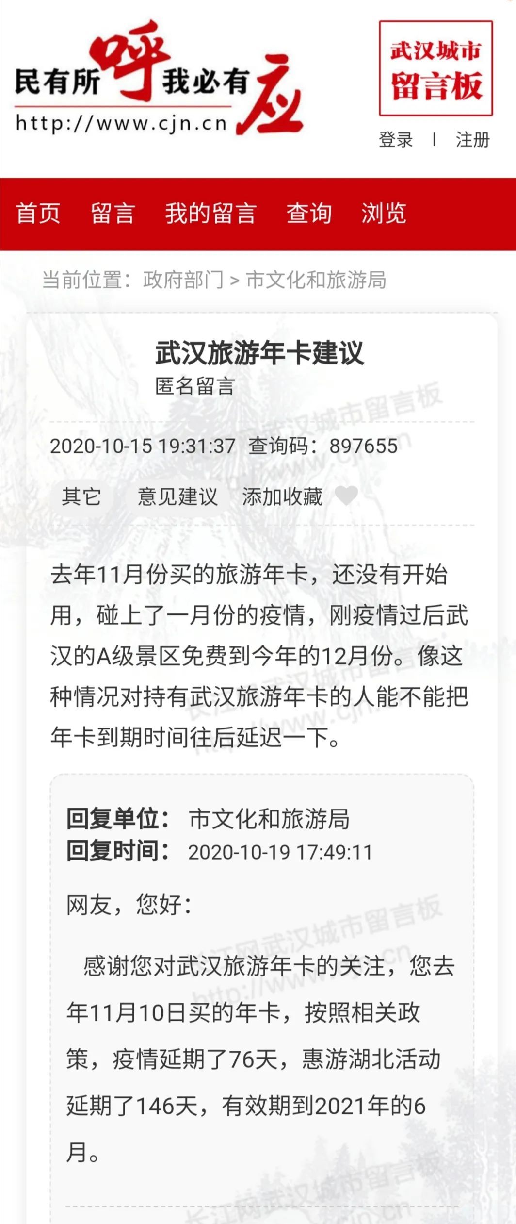 “购买的大武汉旅游年卡只用了两次,赶上今年的特殊情况,期限能否延长?”