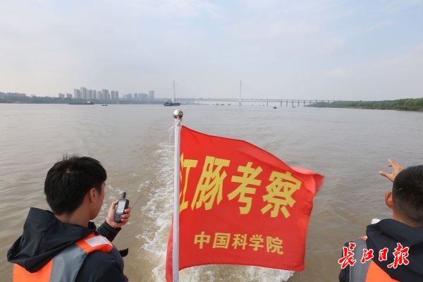 科研人员在目测武汉段江面进行科考。记者高宝燕 摄