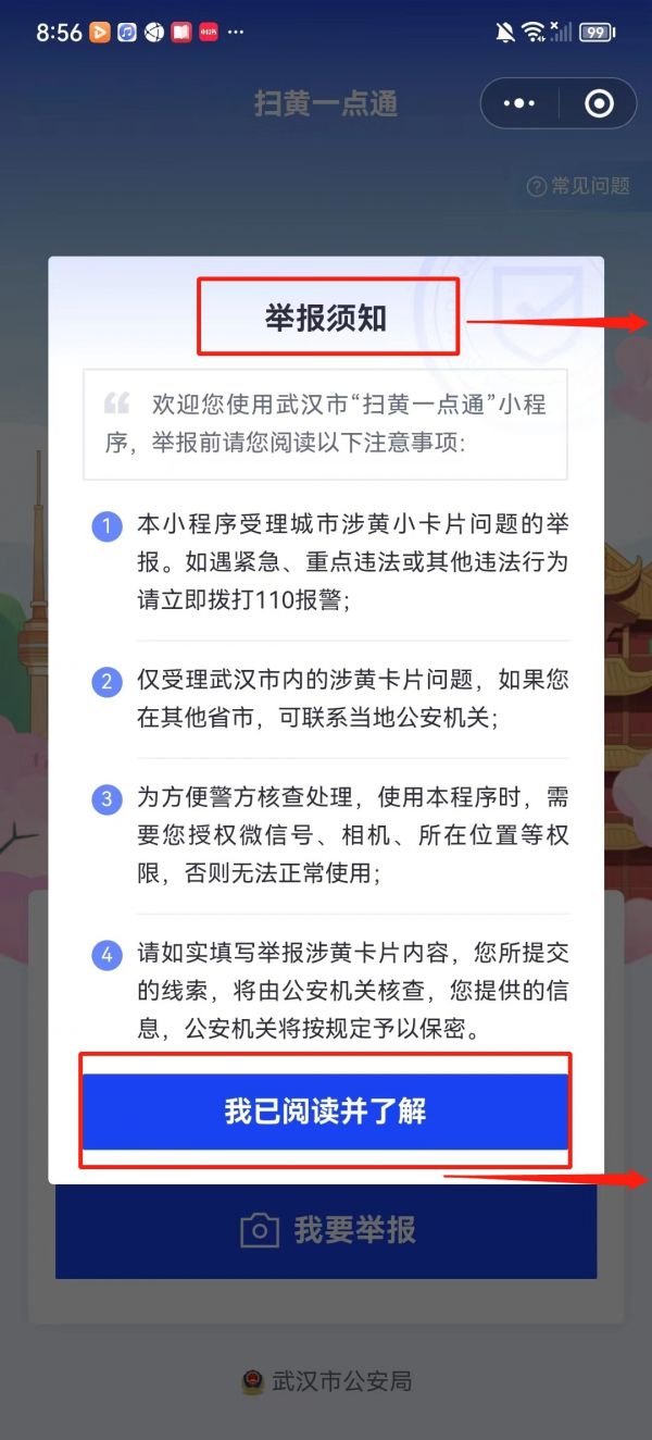 武汉市公安局“扫黄一点通”微信小程序使用办法:
