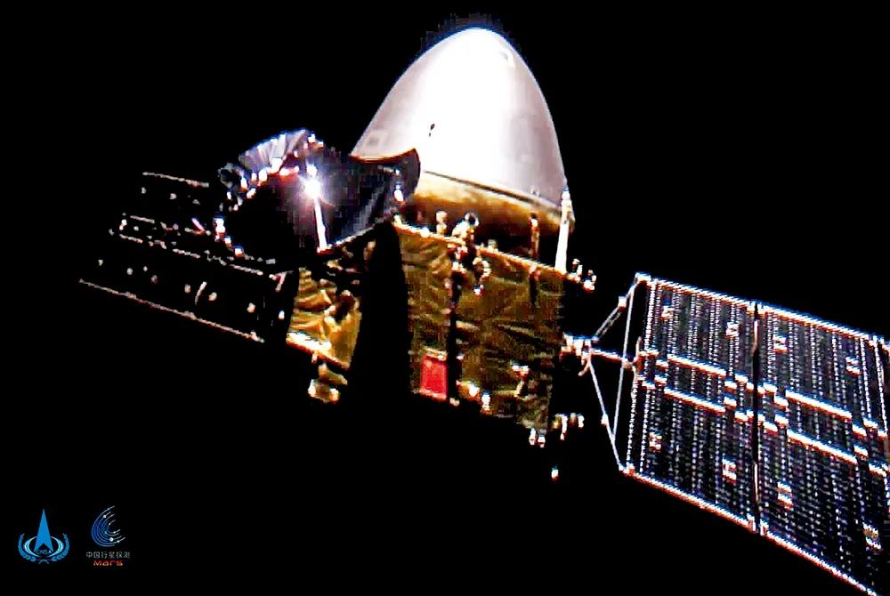 10月1日,国家航天局发布我国首次火星探测任务“天问一号”探测器飞行图像,图上的五星红旗光彩夺目,呈现出鲜艳的中国红。 国家航天局供图