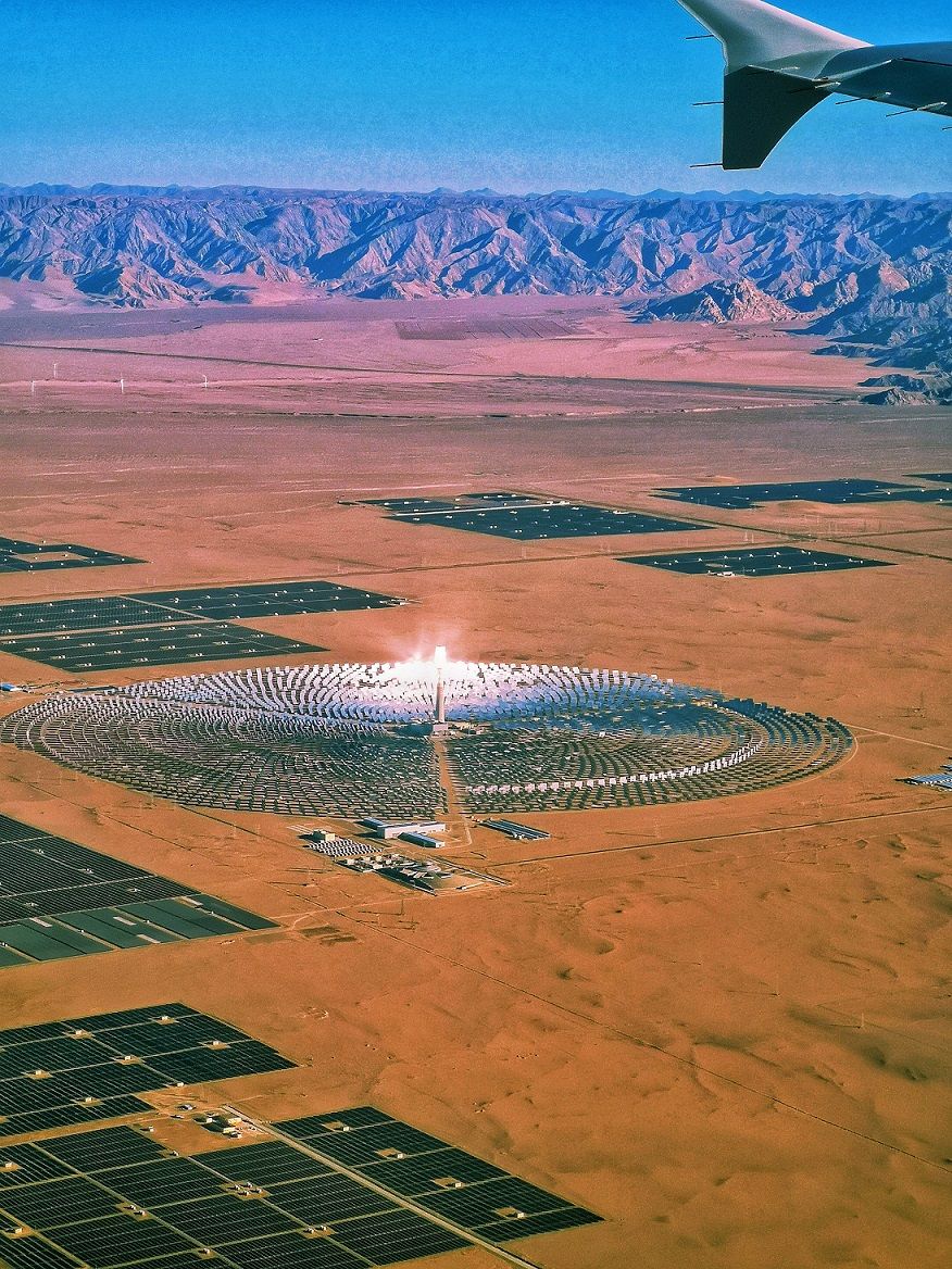 飞越世界上最大的光伏电站群——在格尔木以东27公里处的鲁能海西州格尔木50MW塔式熔盐光热发电站,中心的巨塔和圆形的定日镜,颇有外星科技的魔幻感觉。图据中国绿发会