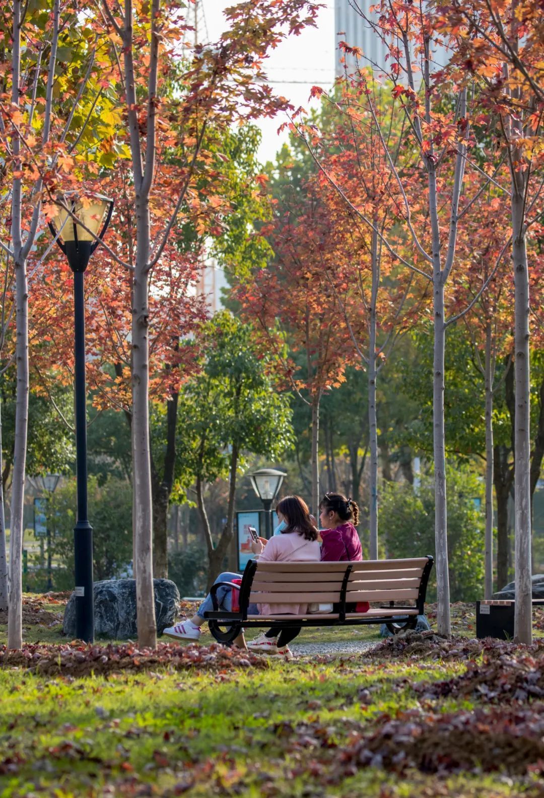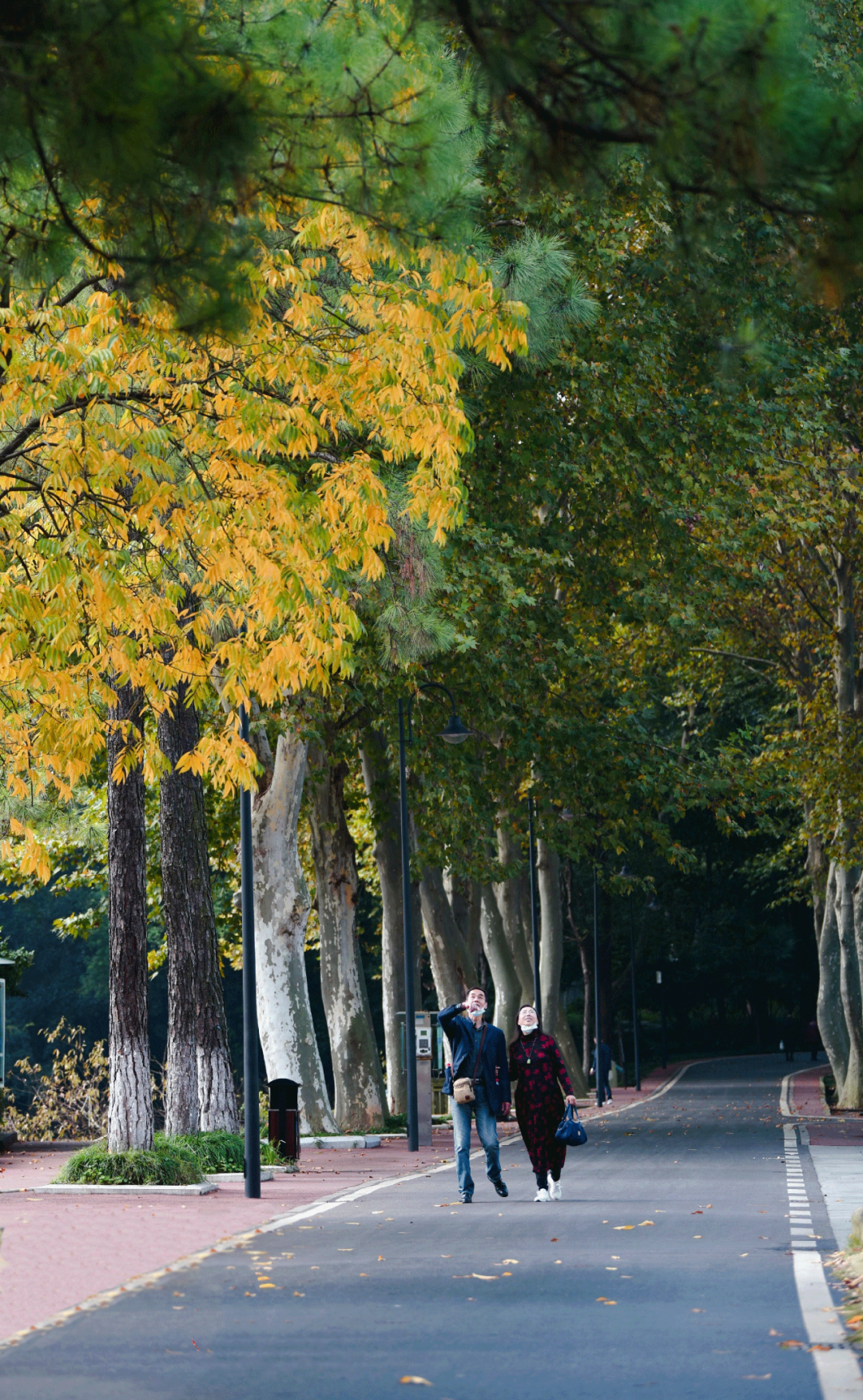 秋叶橙红、游人闲适