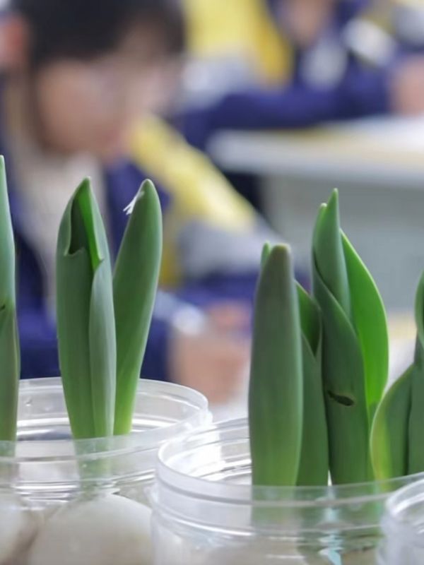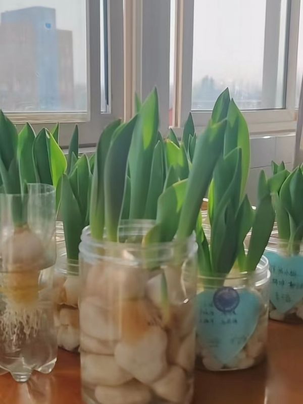 梁老师:这是我第一次种植郁金香,没有经验,所以提前做了很多功课,我是自己先学会了种植方法再教给学生们的。我了解到郁金香可以水培,长得快,开出来的效果也好看,就选定了。
