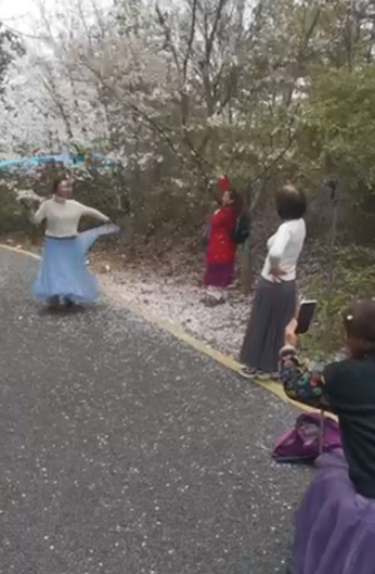 现场视频显示,一位游客打着伞在樱花树下转圈,另一游客边摄影边指挥同行人使劲摇晃樱花树,同行人还在一旁夸赞“我的乖乖,仙女下凡了”。