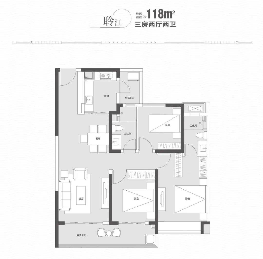 满足全家人需求的民主设计:每一个户型均有明确的动静分区规划,且所有户型尽可能优化观江面,最大化的满足全家人对景观、对功能空间的民主需求。