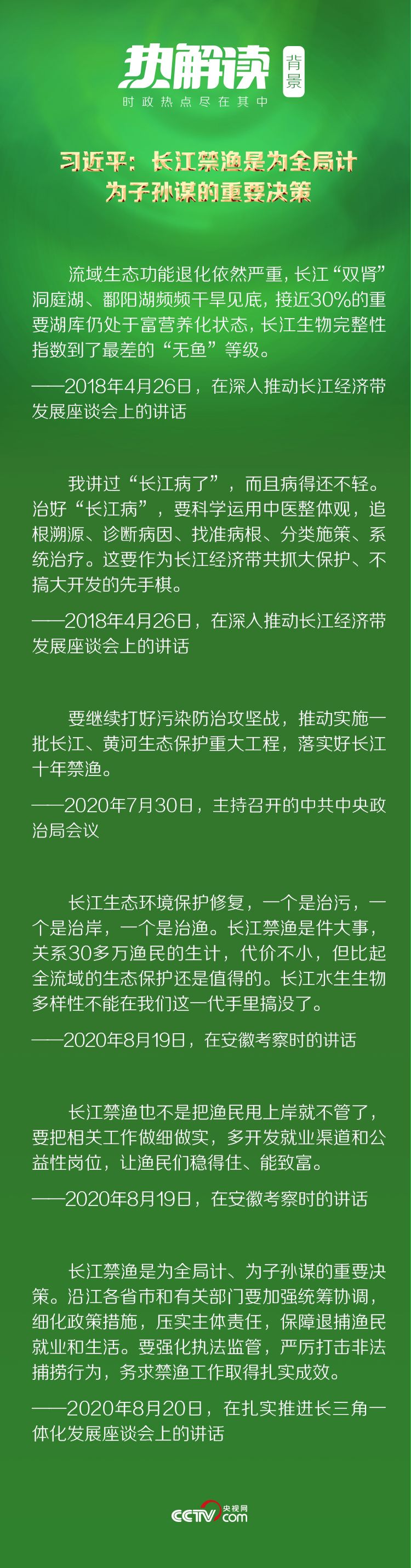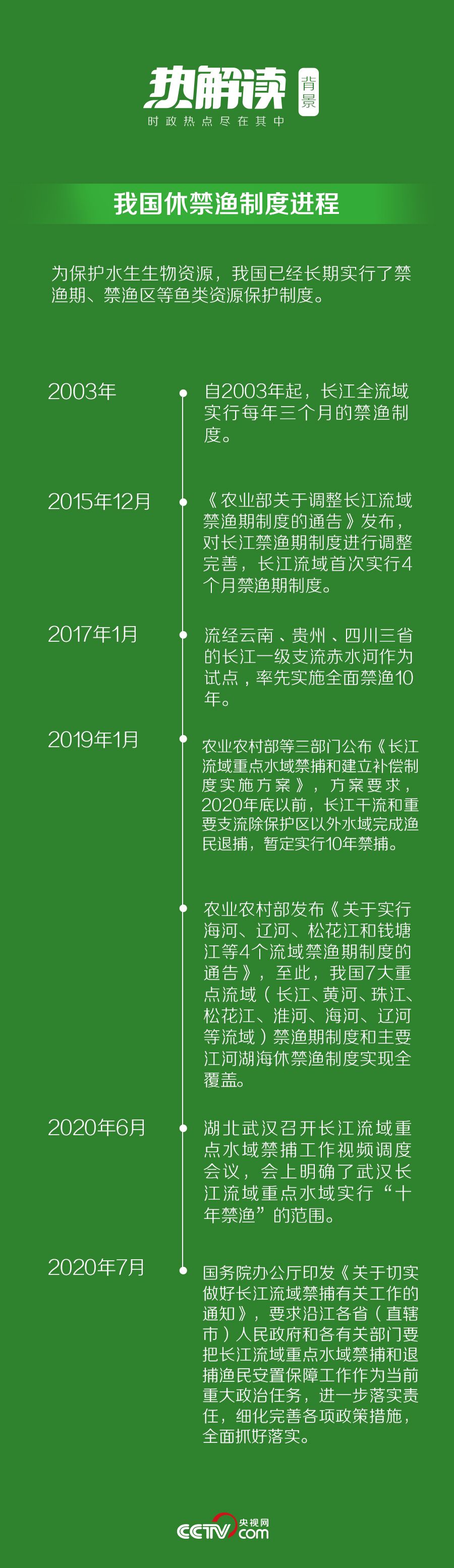 为全局计、为子孙谋。党的十八大以来,在以习近平同志为核心的党中央坚强领导下,我国作出一系列实施长江禁捕退捕的重大决策部署。2020年1月1日起,长江流域332个水生生物保护区已实现全面禁捕。2021年1月1日起,长江流域“一江两湖七河”等重点水域将实行10年禁捕。