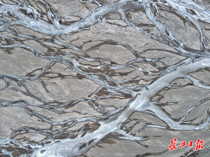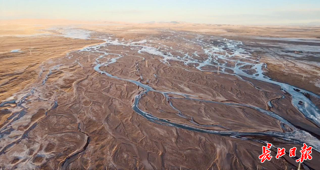 沱沱河辫状水系已经结冰。特派记者范芃 无人机航拍