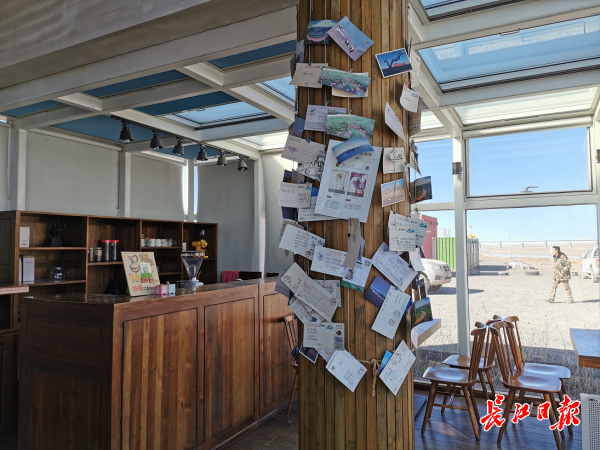 在邮局内的明信片立柱上,贴着一张张暖心的明信片,是全国各地旅游者留下来的,其中还有来自武汉的大学生写的寄语卡,字里行间充满了对长江源的赞美和祝福。