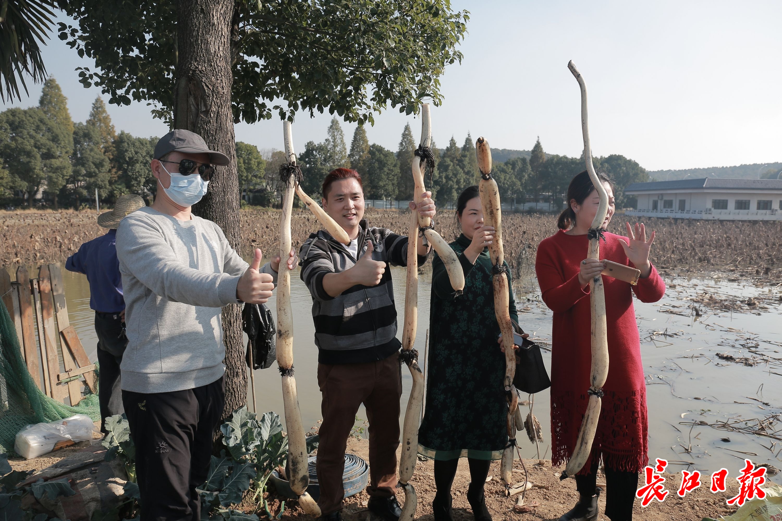 食客和一米多长的野藕合影留念。记者李文婕 摄