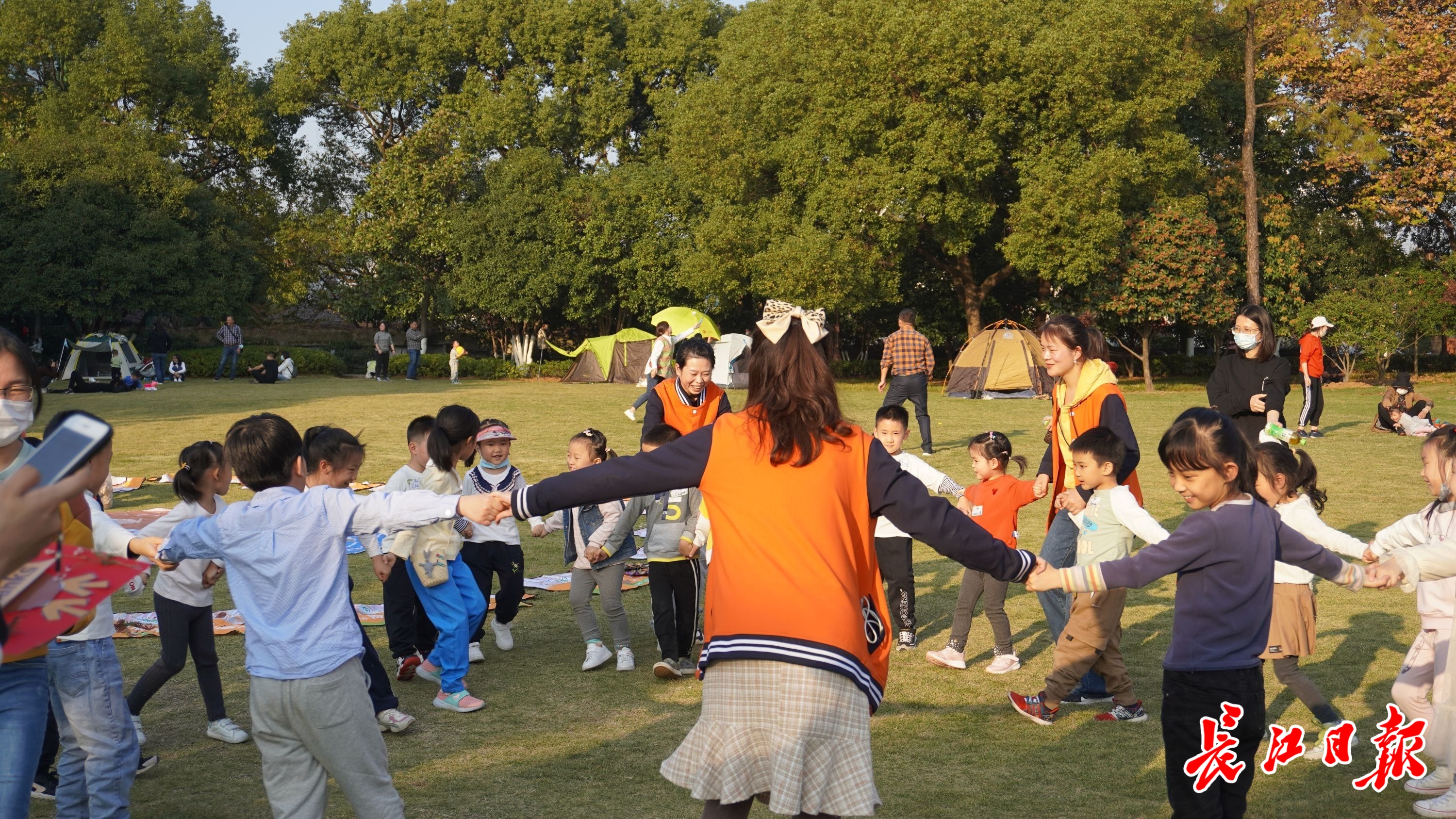 小朋友们在东湖碧潭观鱼旁大草坪上做游戏。 记者宁秀梅 摄