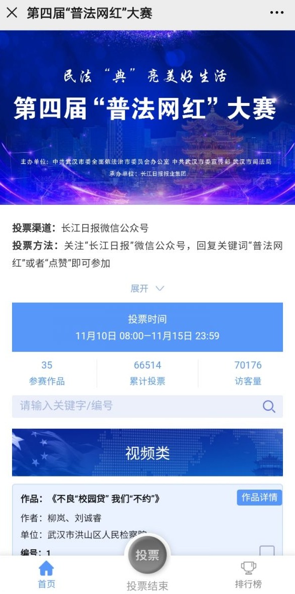 长江日报-长江网11月16日讯(记者夏晶 通讯员吴静)历时6天,第四届“普法网红”大赛网络点赞活动结果揭晓,35件极具创意的普法产品赢得网友66514个点赞。其中,有趣、好看、有内涵的视频类普法情景剧成了广受喜爱的“大赢家”。