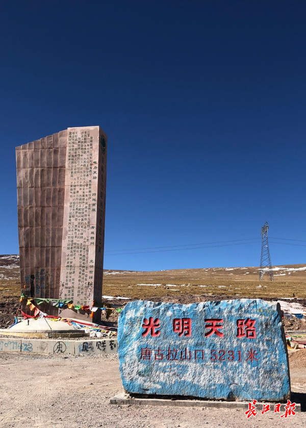 记者在唐古拉山口看到几座石雕像,这是为了纪念修建青藏公路而献出年轻生命的解放军战士修建的;在老的雕像旁,又树起了“光明天路”石碑,为了纪念修建青藏公路的电力工人。这里每一米路,每一段电缆,都是用血肉之躯打造,创造了世界交通史上的奇迹。很多司机经过唐古拉山口,都会鸣笛向为修筑“天路”献出宝贵生命的建筑者致敬。