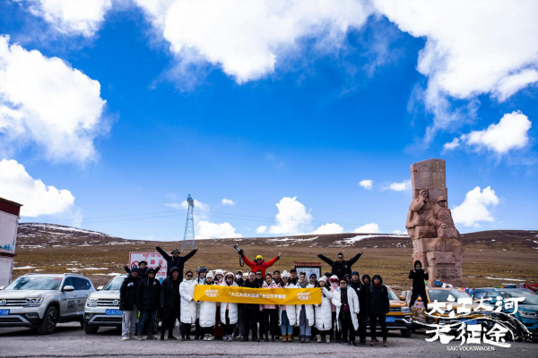 “大江大河大征途”长江行考察团在唐古拉山口纪念碑前留影。