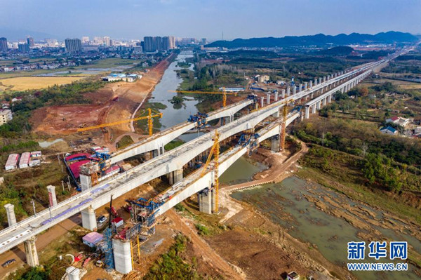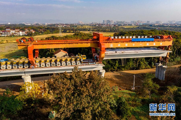 目前,经过参建者艰苦奋战,黄黄高铁(湖北黄冈至黄梅)进入梁体施工高峰。黄黄高铁全长125.12公里,设计时速350公里,是国家中长期铁路网规划中“八纵八横”之一的武杭高铁、京九高铁段的组成部分。 新华社记者 杜华举 摄