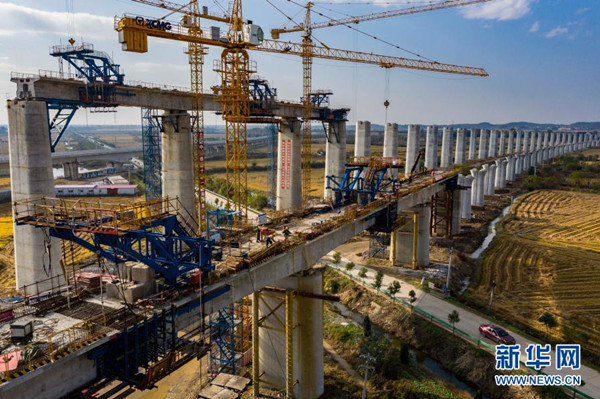 11月18日,在湖北省黄梅县境内拍摄的中铁十一局黄黄高铁新县河特大桥连续梁浇筑现场(无人机照片)。