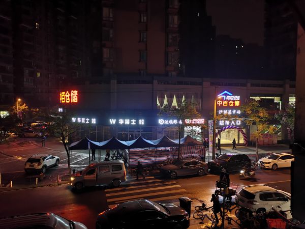 夜间中百仓储沙湖店附近门面未关灯。 网民提供