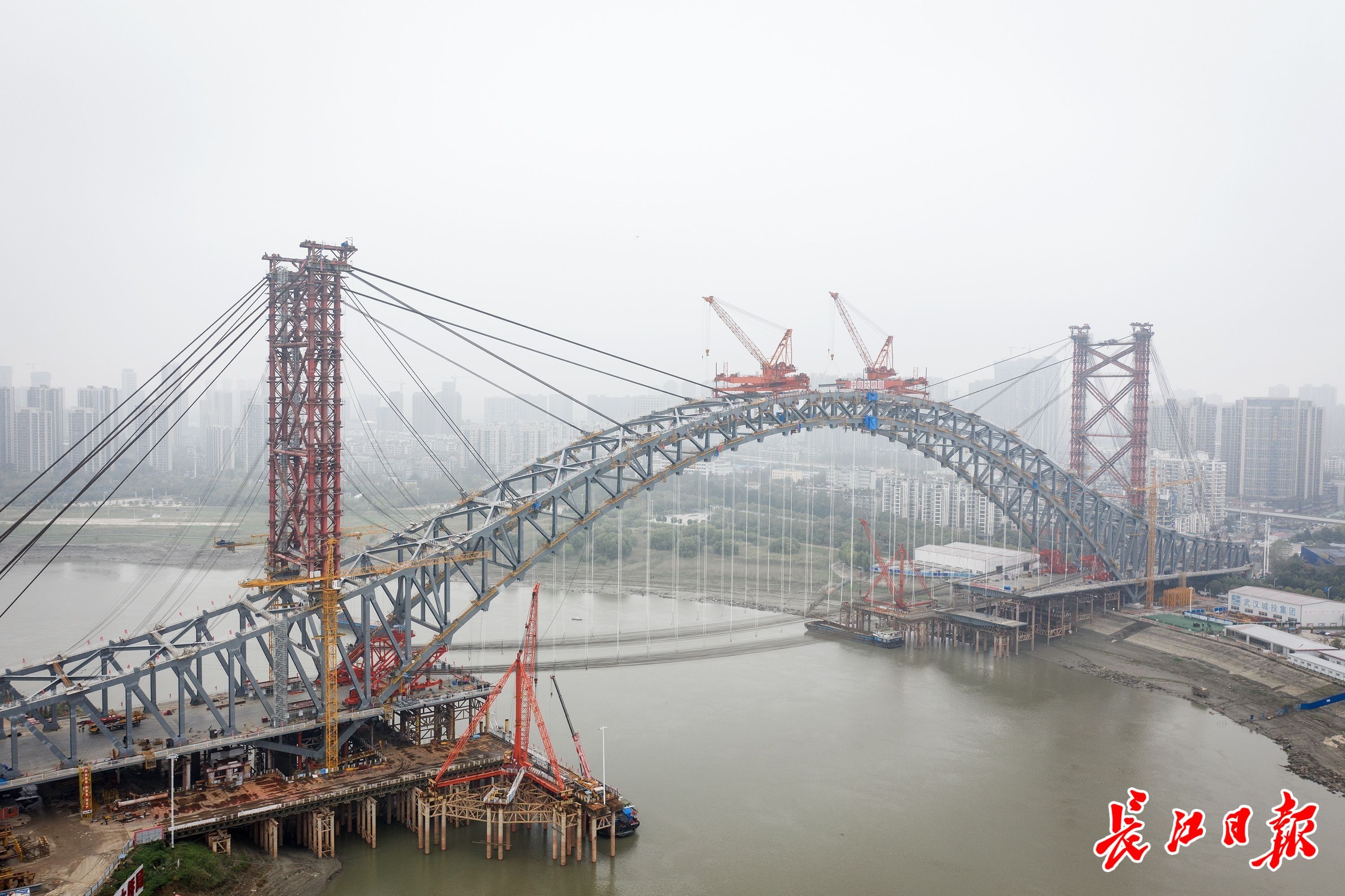 上午9时,长江日报-长江网记者在现场看到,桥梁主拱正在进行合龙最后施工。一拱飞跃汉江两岸,连接硚口古田四路和汉阳玉龙路,桥型优美。