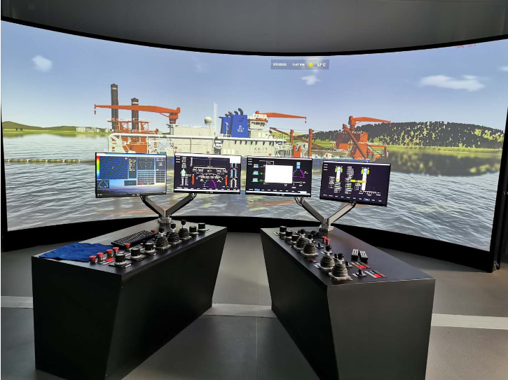 打开仿真平台系统,弧面的屏幕立体感极强,当画面切入时,就如同实战演练一般,原来,操控台与施工现场实际挖泥船上的操控台是完全一样的。