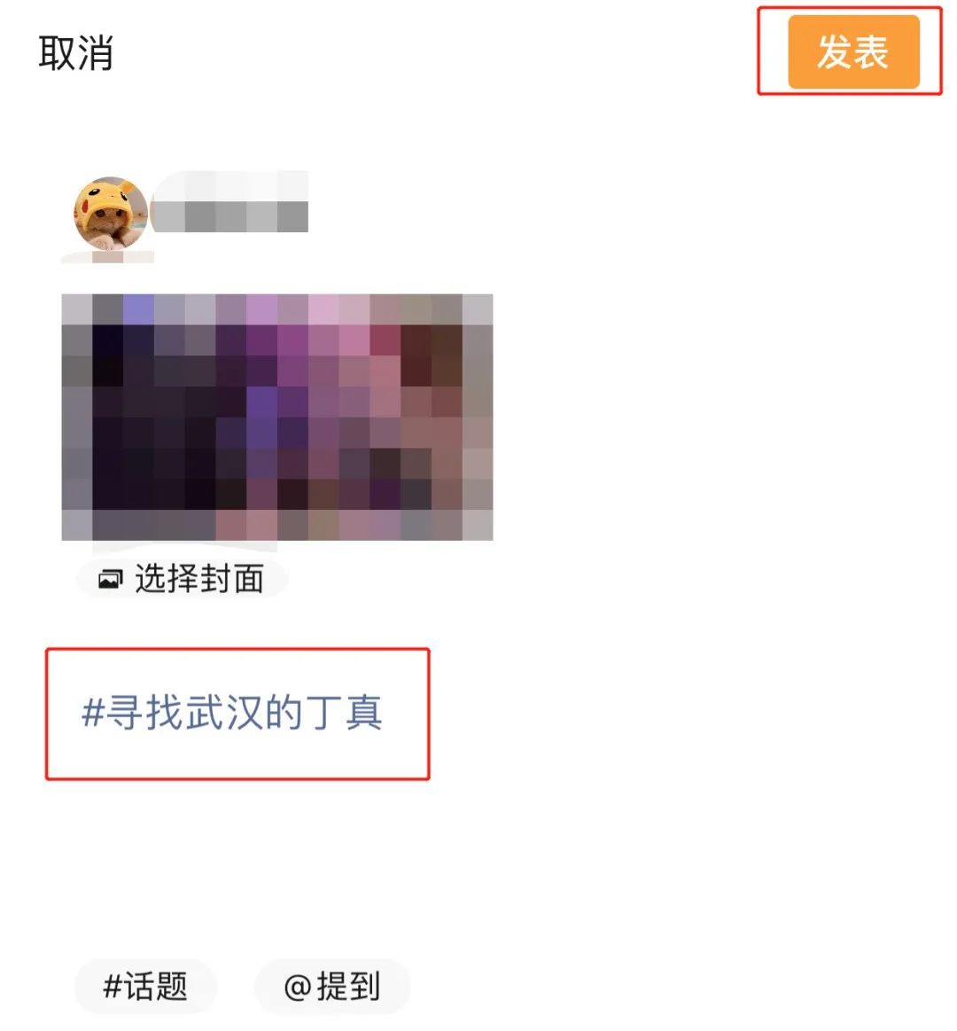 7.加上话题#寻找武汉的丁真,点击右上角“发表”;
