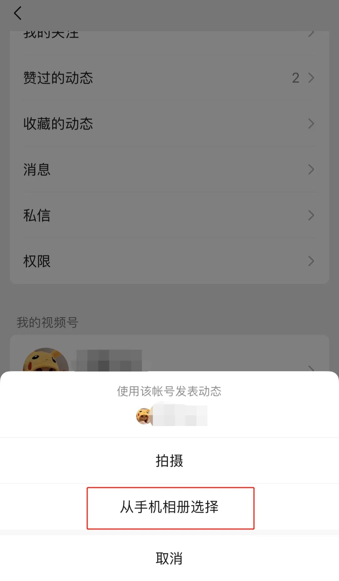 4.选择“拍摄”或“从手机相册选择”(此处以事先拍好视频,直接从手机相册选择为例);