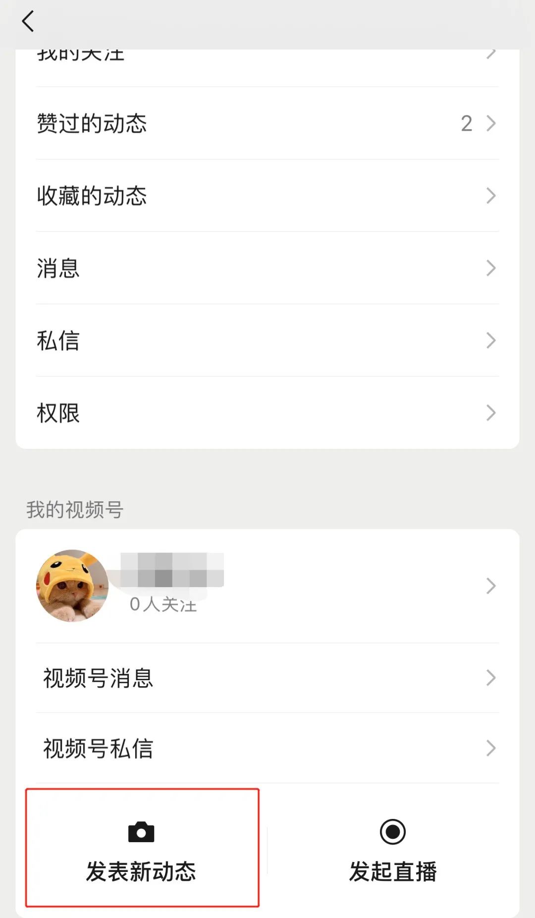 3.找到最下方“我的视频号”(若没有需新创建一个),点击“发表新动态”;