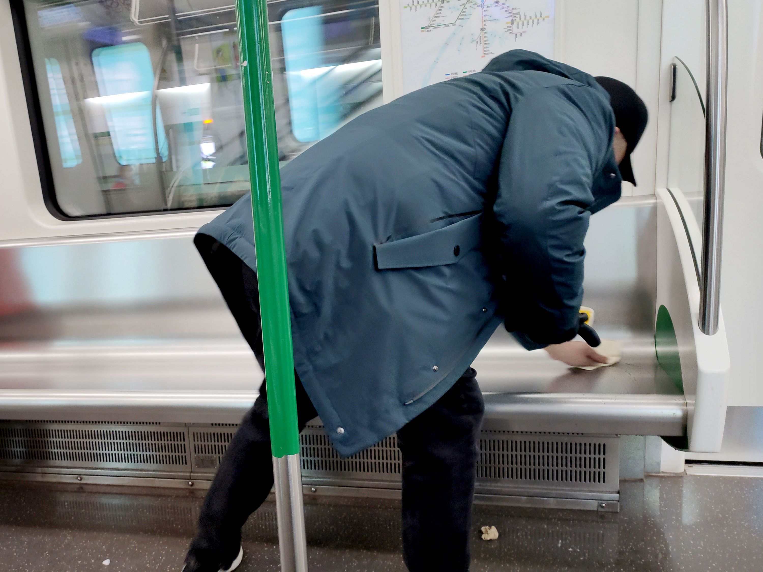 长江日报-长江网11月30日讯 乘坐地铁列车时,一位中年男乘客发现对面座椅上有水渍,随后起身脱下手套,拿出纸巾一遍又一遍擦拭干净。这一过程被坐在身旁的乘客李女士看到,并用手机记录了整个过程。
