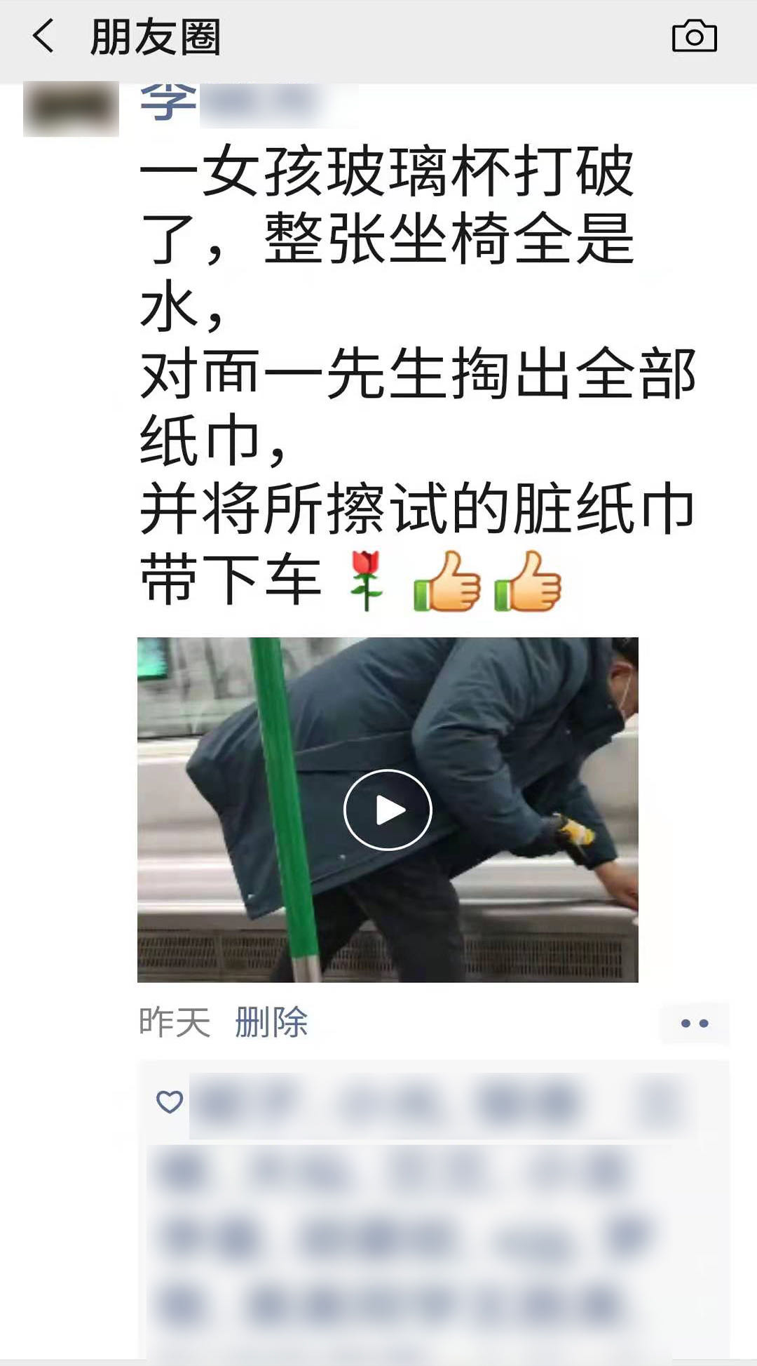 当日,李女士将这则视频发在自己的微信朋友圈,记录这件令她感动的小事:“对面的先生掏出全部纸巾,并将所擦拭的脏纸巾带下车。”朋友圈引导来众多“圈内人”点赞留言,李女士评价说:“善意温暖着他人,身边荡漾暖流!”