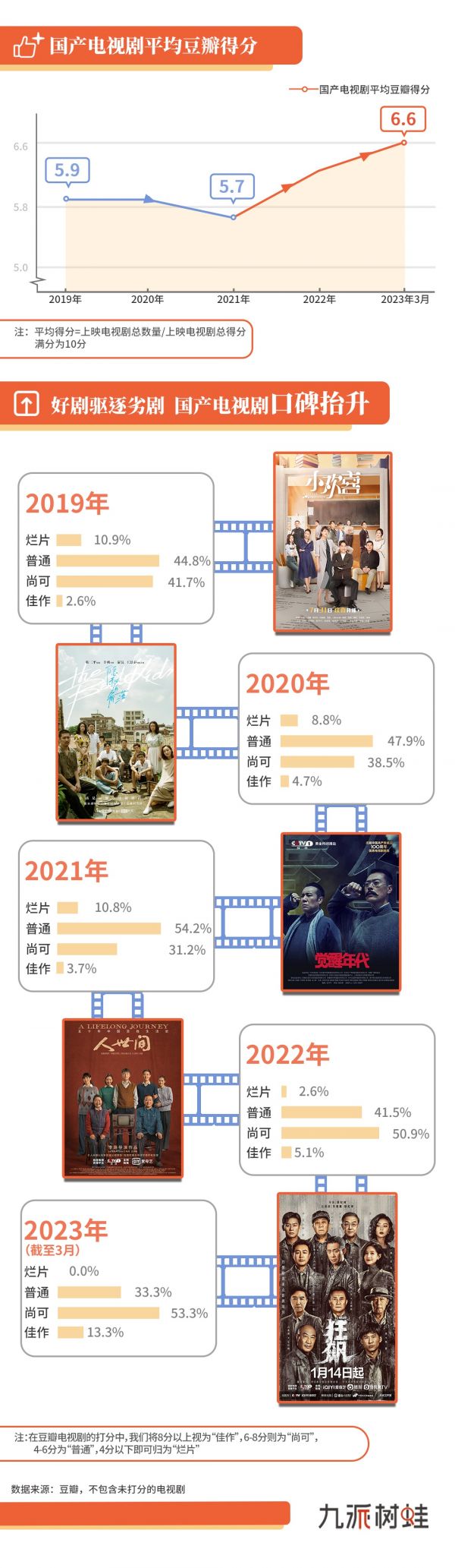 豆瓣对于一部电视剧的打分,满分为10分,6分通常视为及格线。豆瓣数据显示,国内电视剧的平均得分从2019年的5.9分提升至2023年的6.6分。这意味着我国电视剧的整体口碑,在广大网友心中,已从“不及格”走向了“及格”。