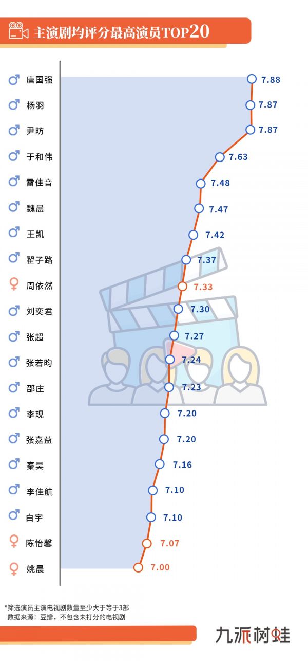 豆瓣数据显示,唐国强、杨羽、尹昉、于和伟、雷佳音是主演平均得分最高的五名演员。70岁唐国强与51岁的于和伟,均是标准的“老戏骨”。尤其是作为国家一级演员的唐国强,他主演的电视剧平均分均在7.88分以上,位列第一。