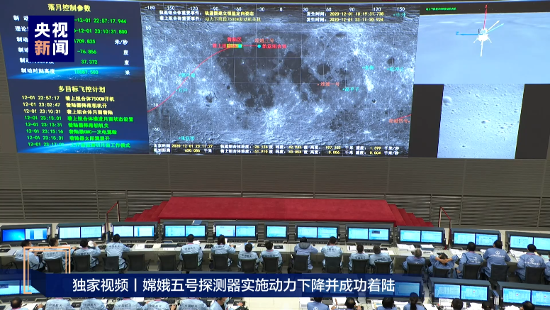 12月1日22时57分,嫦娥五号着陆器和上升器组合体从距离月面约15公里处开始实施动力下降,7500牛变推力发动机开机,逐步将探测器相对月球速度从约1.7 公里/秒降为零。
