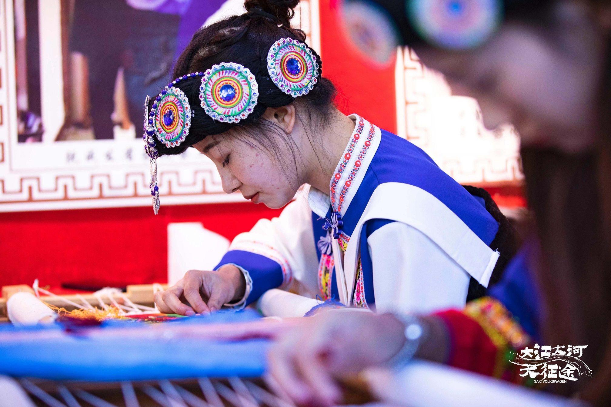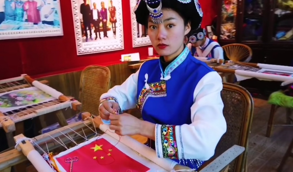 云南玉龙雪山脚下白沙镇,纳西族少女正向滇绣大师彭萍学习滇绣手法。她长得像年轻时的李嘉欣。