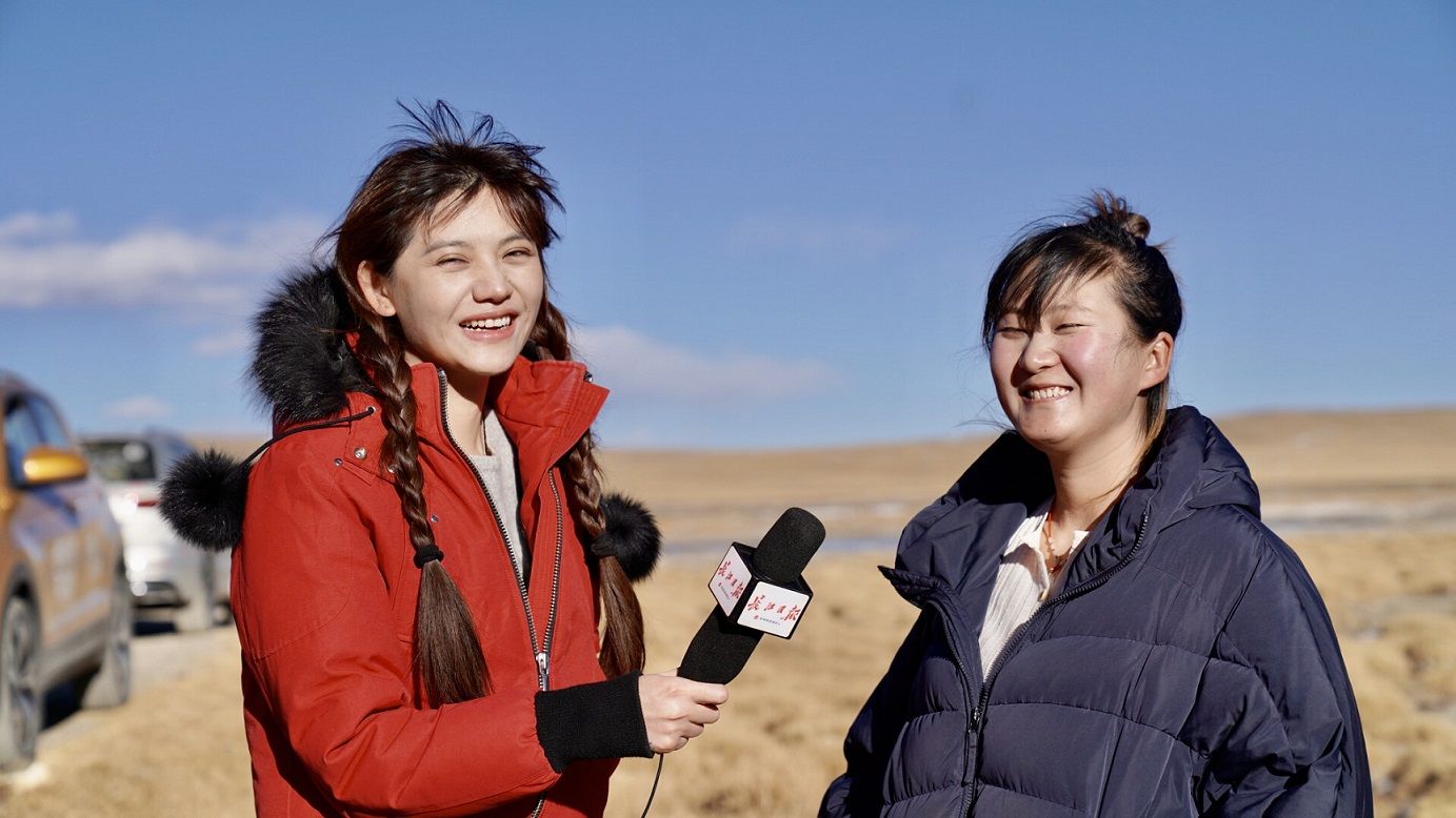 那曲夯措湖畔,新华网美女主播客串长江日报主持人,采访湿地公园工作人员如何保护野生动物。