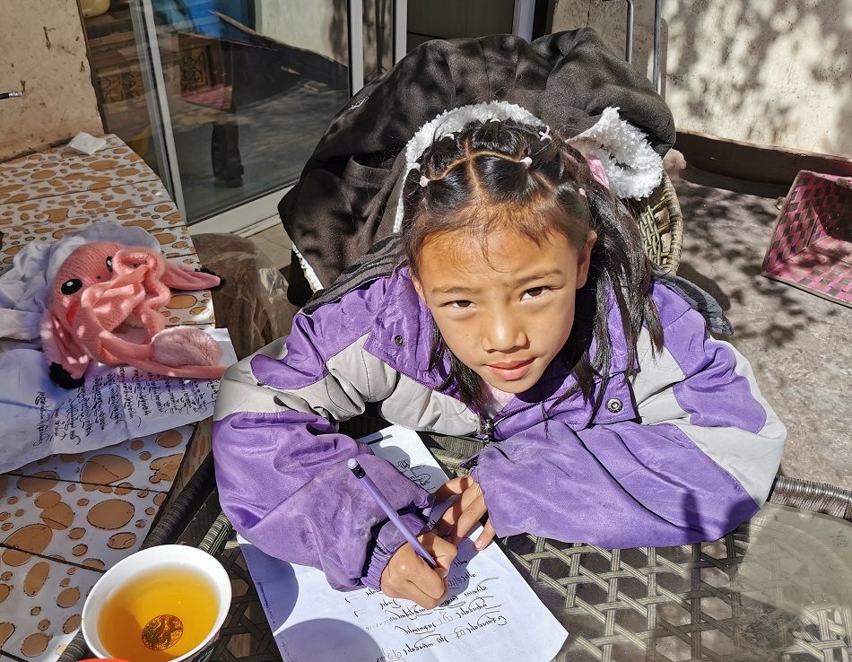 澜沧江畔千年古盐田边的盐井村,正在写藏文作业的藏族小姑娘。