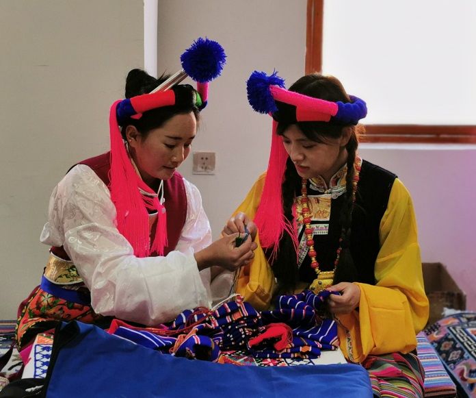 茶马古道的节点城市德钦,教汉族女孩制作藏族服饰的藏族少女(左)。
