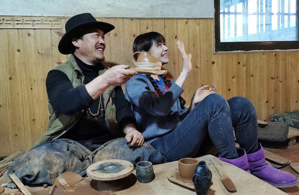 非遗传承人鲁茸松主教新华网美女主播成功制作黑陶酥油茶罐,面对镜头笑开了花。