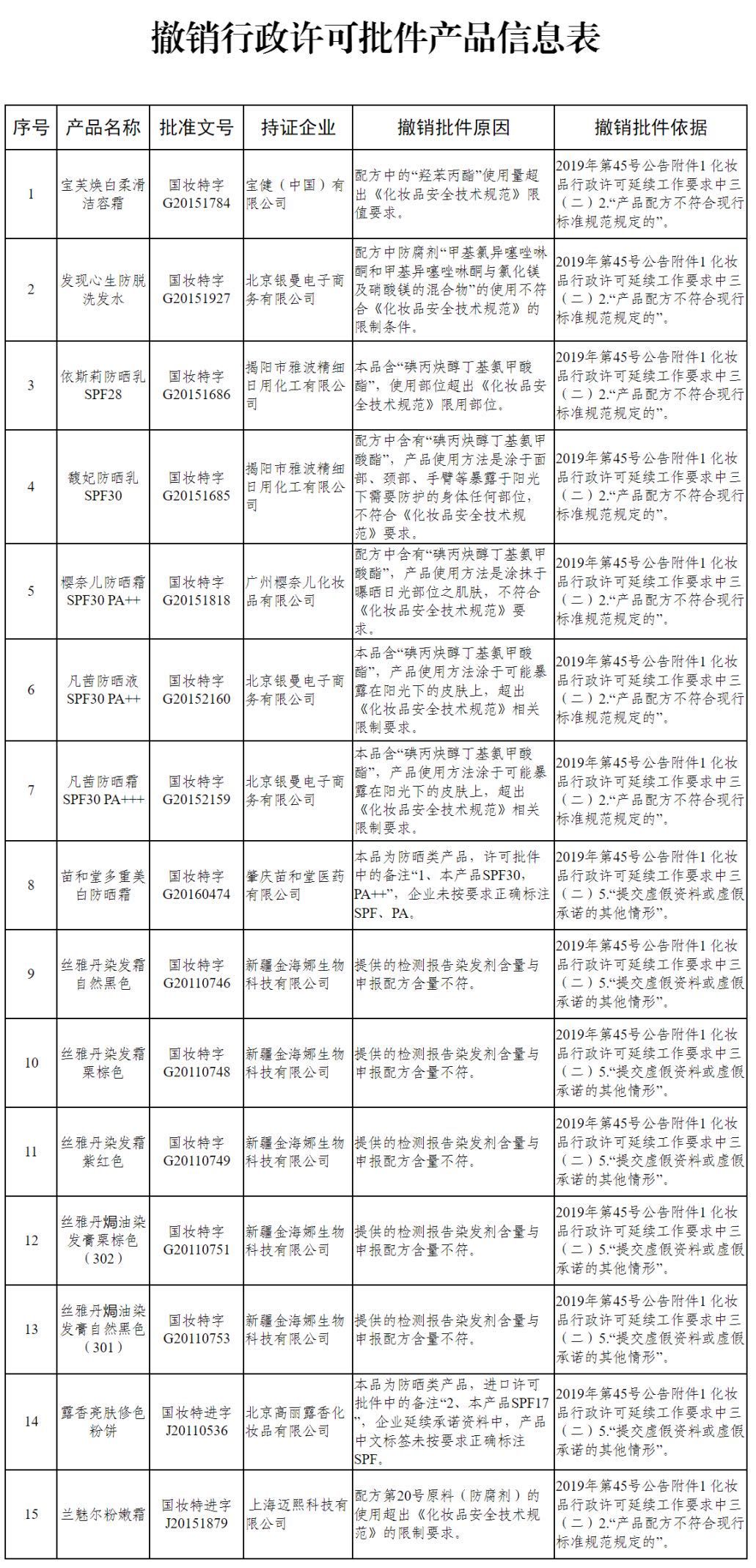 依据《关于实施特殊用途化妆品行政许可延续承诺制审批有关事宜的公告》(2019年第45号)要求,国家药品监管局组织开展特殊用途化妆品行政许可批件延续申报资料技术审查,发现产品名称为“宝芙焕白柔滑洁容霜”(批准文号:国妆特字G20151784)等15个特殊用途化妆品,存在不符合产品安全性相关规定要求等违法违规情形,现依法予以撤销批准文号。