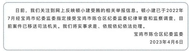 6日下午,宝鸡市陈仓区纪委监委发布公告称:日前,我们关注到网上反映顿小建受贿的相关举报信息。顿小建已于2022年7月经宝鸡市纪委监委指定接受宝鸡市陈仓区纪委监委纪律审查和监察调查,目前案件已移送司法机关。我们将实事求是、依规依纪依法处理。