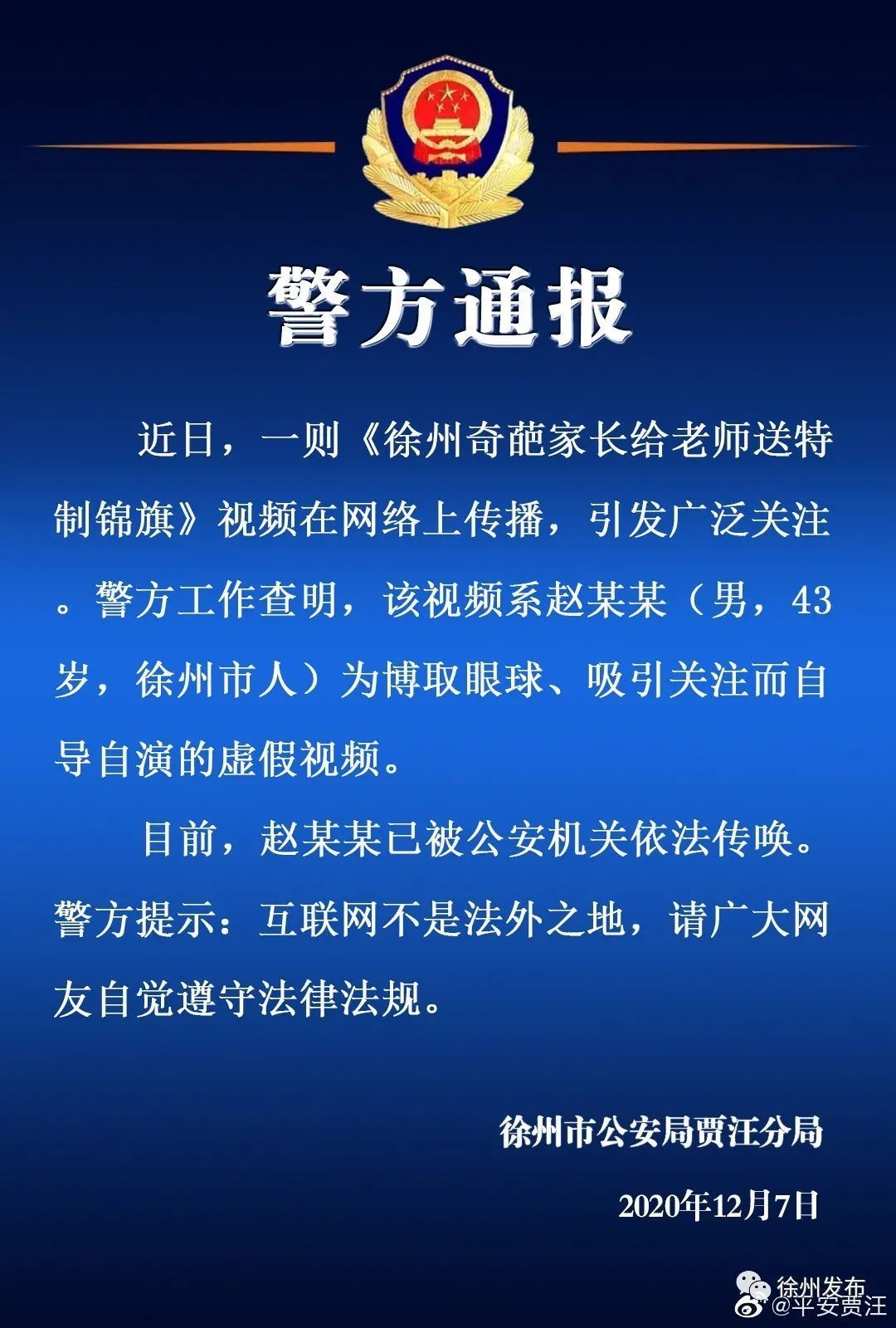 家长送老师“不作为锦旗”?警方:虚假视频制作者已被传唤 2020-12-07 15:21 长江日报-长江网 0 此前网传视频截图。 刚刚,江苏省徐州市公安局贾汪区分局官方微博发布通报。此前,教育局辟谣“家长送老师不作为锦旗”:查无此校此人。 (来源:人民日报客户端 徐州发布) 【编辑:金鑫】