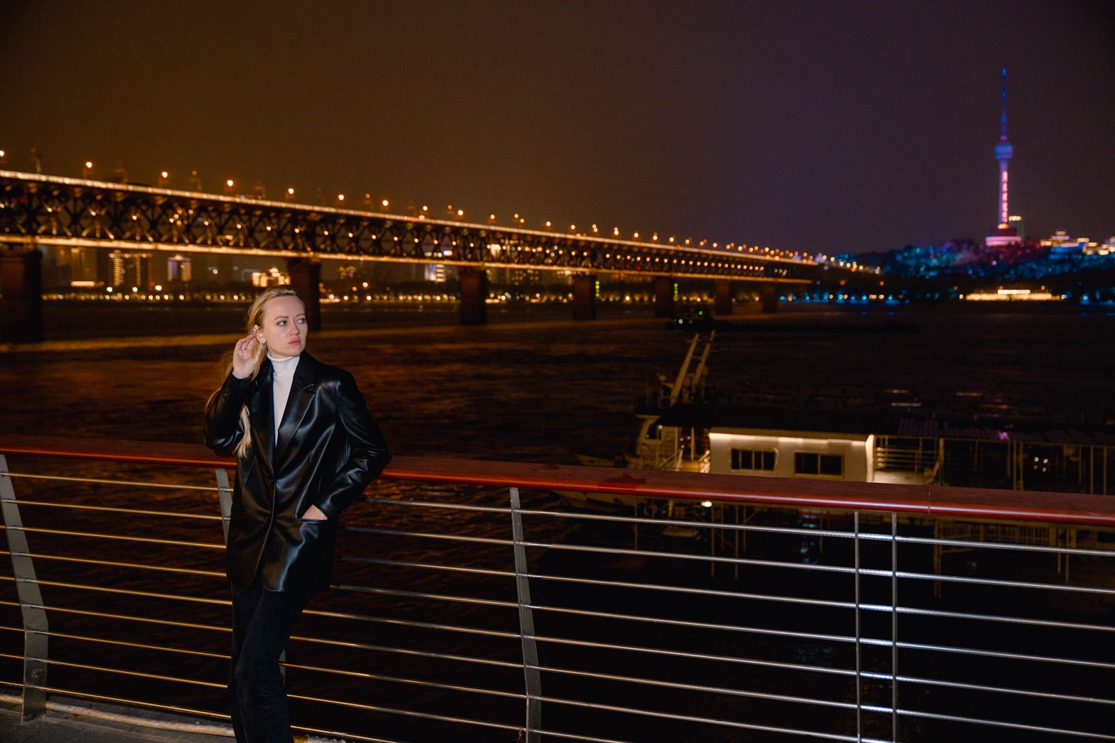 夜色渐晚,步行到武昌江滩。江边眺望“万里长江第一桥”武汉长江大桥气势磅礴,已走过60多年历史沧桑,长江大桥武昌部分引桥位置即是当年黄鹤楼故址。